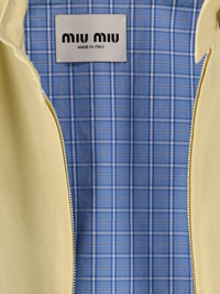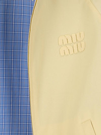 MIU MIU YELLOW YELLOW COTTON TWILL JACKET WITH HIGH NECK, BUTTON AND ZIP CLOSURE, DROPPED SHOULDERS, TONE-ON-TONE LOGO EMBROIDERY ON THE FRONT, TWO SIDE POCKETS, CONTRAST CHECK LINING DETAIL, BUTTON CUFFS, STRAIGHT HEM. PRODUCT INFO PRODUCT CODE ML1463 OOO 1BMSF0032 COMPOSITION: 100% COTTON SIZE AND FIT: SOFT FIT MADE IN: ITALY