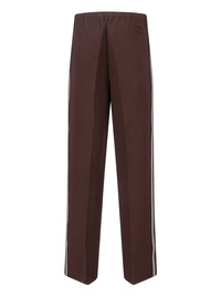 MIU MIU BROWN KNIT FABRIC STITCH PANTS WITH ELASTIC MID WAIST, TWO SIDE ZIP POCKETS, CONTRAST BAND ON THE HIPS, TONAL LOGO EMBROIDERY, STRAIGHT LEG. PRODUCT INFO PRODUCT CODE MP1935 OOO 18FQF0324 COMPOSITION: 85% VISCOSE, 11% POLYAMIDE, 4% ELASTANE SIZE AND FIT: SOFT FIT MADE IN: ITALY