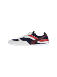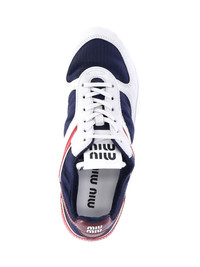 MIU MIU “GYMNASIUM” SNEAKERS, BLUE FABRIC, WHITE SUEDE TRIM, ROUND TOE, LACE-UP CLOSURE, LOGO LABEL ON TONGUE, BORDEUAX AND RED LEATHER SIDE INSERTS, BURGUNDY LEATHER BACK TAB, WHITE LOGO PRINT DETAIL, RUBBER SOLE. PRODUCT INFO PRODUCT CODE 5E428E A005 71LF001Z COMPOSITION: 100% POLYAMIDE MADE IN: ITALY - DETAILS: 100% CALF LEATHER - SOLE: 100% RUBBER
