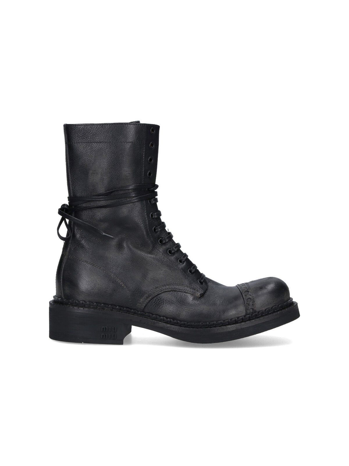 MIU MIU LACE UP ANKLE BOOTS IN BLACK CALF LEATHER WITH DISTRESSED EFFECT, ROUND TOE, LACE AND ZIP CLOSURE, GOLD METAL LOGO ON THE TONGUE, PUNCTURES ON THE UPPER, TONE-ON-TONE LOGO DETAIL ON THE SIDE, RUBBER SOLE. PRODUCT INFO PRODUCT CODE 5U316E G035 2KJF0002 COMPOSITION: 100% CALF LEATHER SIZE AND FIT: HEEL HEIGHT 3.5 CM MADE IN: ITALY - SOLE: 100% RUBBER
