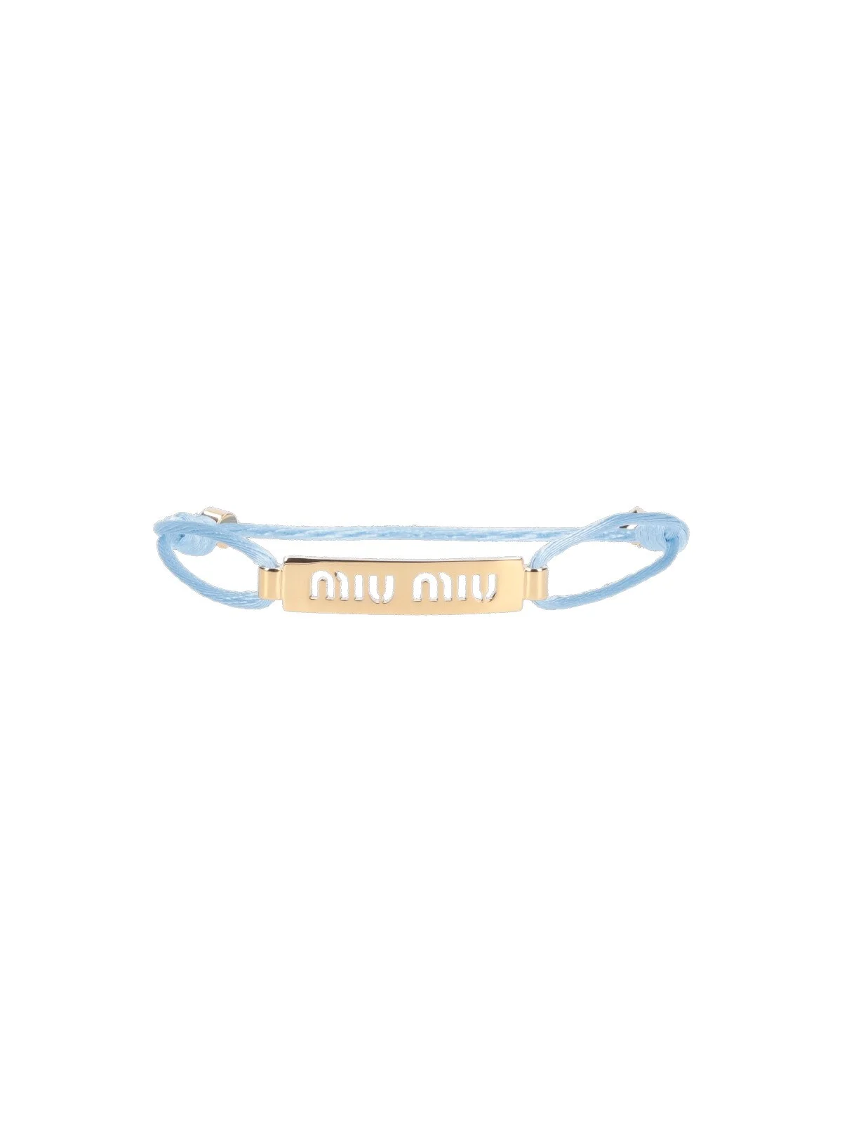 MIU MIU LOGO BRACELET IN LIGHT BLUE FABRIC ROPE, GOLD BRASS LOGO HARDWARE ON THE FRONT, ADJUSTABLE STRAP. PRODUCT INFO PRODUCT CODE 5IB785 2IHKF0UO8 COMPOSITION: 100% POLYESTER MADE IN: ITALY - TRIMS: 100% BRASS