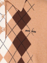 MIU MIU BROWN CASHMERE LOGO SWEATER WITH CLASSIC COLLAR, BUTTON CLOSURE, DROPPED SHOULDERS, DIAMOND-PATTERNED DETAIL, CHEST LOGO PRINT, RIBBED TRIM, STRAIGHT HEM. PRODUCT INFO PRODUCT CODE MMLB65 OOO 174BF0040 COMPOSITION: 100% CASHMERE SIZE AND FIT: SOFT FIT