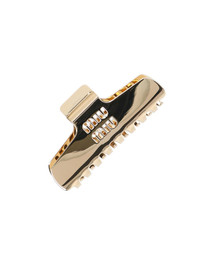 MIU MIU LOGO CLASP IN GOLD BRASS, OPENWORK LOGO ON THE FRONT AND BACK, CLIP CLOSURE. PRODUCT INFO PRODUCT CODE 5IF218 2DTUF0056 COMPOSITION: 100% BRASS SIZE AND FIT: H 3.9 X L 10 CM MADE IN: ITALY