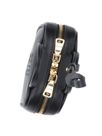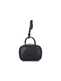 MIU MIU LOGO TRICK IN BLACK CALF LEATHER WITH TWO HANDLES, REMOVABLE STRAP DETAIL, DOUBLE ZIP CLOSURE, EMBOSSED LOGO ON THE FRONT, ONE INNER COMPARTMENT. PRODUCT INFO PRODUCT CODE 5NR036 AF8WF0002 COMPOSITION: 100% CALF LEATHER SIZE AND FIT: H 7 X W 11 X D 4 CM MADE IN: ITALY