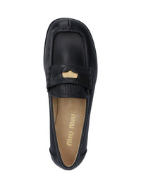 MIU MIU 'PENNY' BLACK LEATHER LOAFERS WITH SQUARE TOE, CUT-OUT TOP BAND, GOLD METAL PENNY CHARM DETAIL, EMBOSSED LOGO ON THE TONGUE, SLIP-ON FIT, LEATHER SOLE. PRODUCT INFO PRODUCT CODE 5D398E 010 248F0002 COMPOSITION: 100% CALF LEATHER MADE IN: ITALY - SOLE: 100% LEATHER