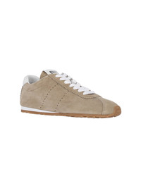 MIU MIU 'PLUME' SNEAKERS IN BEIGE SUEDE WITH ROUND TOE, LACE-UP CLOSURE, LOGO LABEL ON THE TONGUE, WHITE LEATHER BACK TAB, CONTRAST EMBOSSED LOGO DETAIL, RUBBER SOLE. PRODUCT INFO PRODUCT CODE 5E114E 005 054F0F24 COMPOSITION: 100% CALF LEATHER MADE IN: ITALY - SOLE: 100% RUBBER