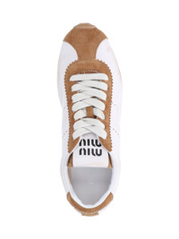 MIU MIU 'PLUME' SNEAKERS IN WHITE AND BROWN LAMB NAPPA LEATHER WITH ROUND TOE, LACE-UP CLOSURE, LOGO LABEL ON TONGUE, CONTRAST LOGO PRINT ON THE BACK TAB, RUBBER SOLE. PRODUCT INFO PRODUCT CODE 5E114E 005 3LP9F0LT1 COMPOSITION: 100% LAMBSKIN MADE IN: ITALY - SOLE: 100% RUBBER