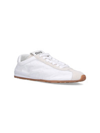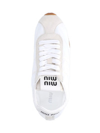 MIU MIU PLUME SNEAKERS IN WHITE NYLON WITH ROUND TOE, LACES, LOGO LABEL ON TONGUE, CONTRASTING LOGO PRINT ON THE BACK TAB, AND RUBBER SOLE. PRODUCT INFO PRODUCT CODE 5E114E D005 D7CF0009 COMPOSITION: 100% POLYAMIDE MADE IN: ITALY - SOLE: 100% RUBBER