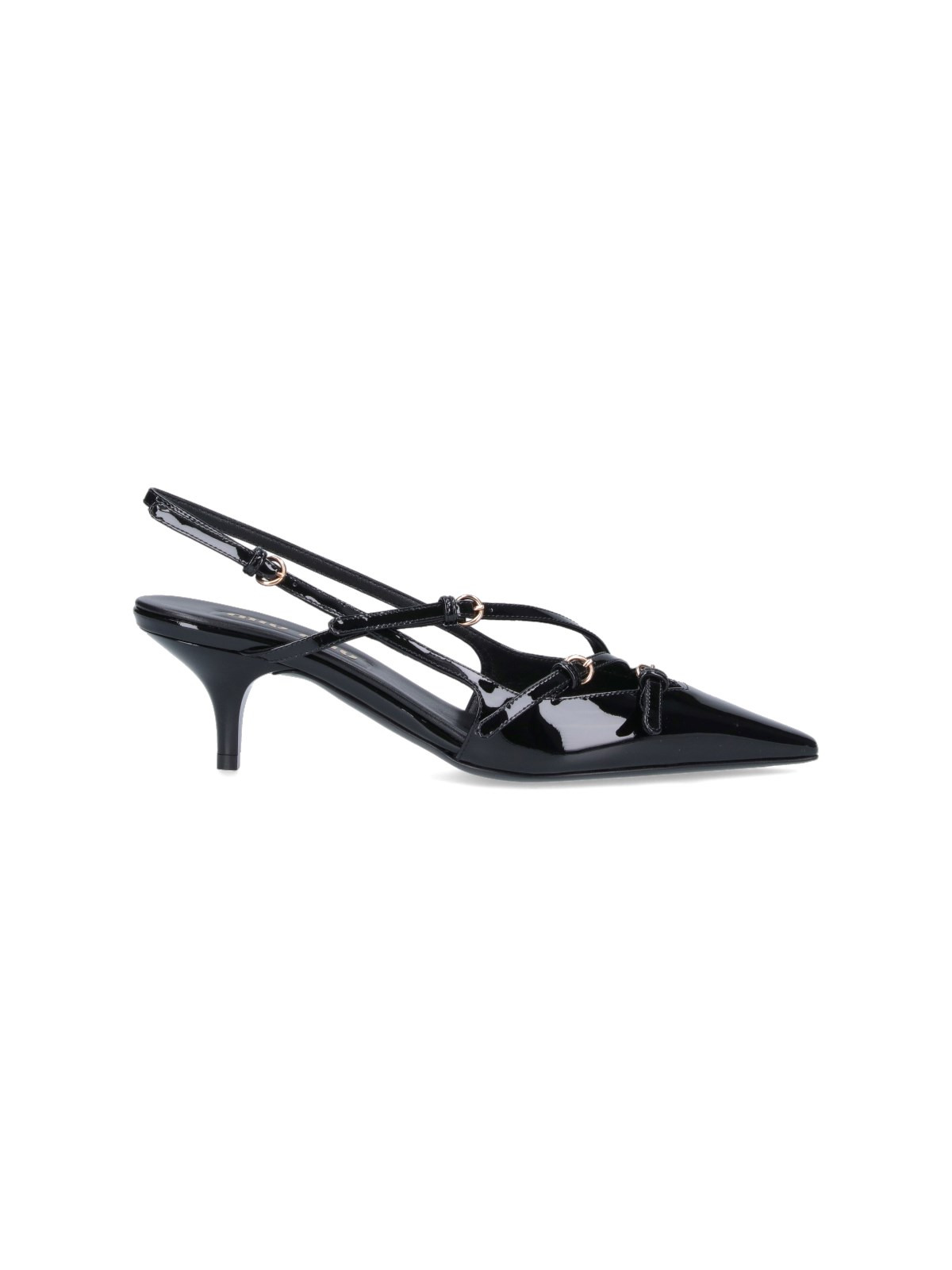 MIU MIU SLINGBACK PUMPS IN BLACK LEATHER WITH POINTED TOE, ADJUSTABLE TOP STRAP DETAIL, GOLD BUCKLES, LEATHER SOLE. PRODUCT INFO PRODUCT CODE 5I013E M055 069F0002 COMPOSITION: 100% LEATHER MADE IN: ITALIA - SOLE: 100% LEATHER - HEEL: 5.5 CM
