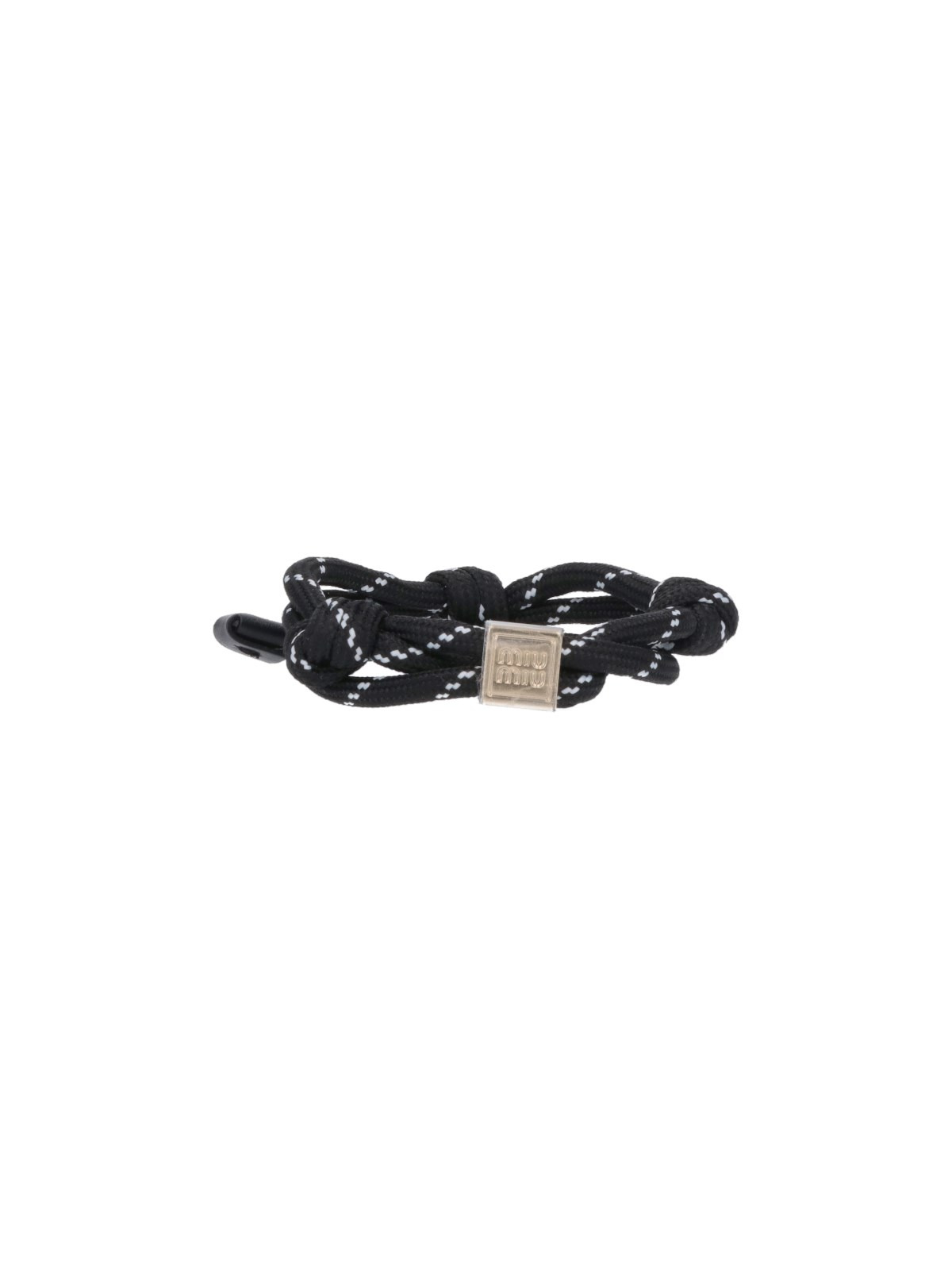 MIU MIU CORD BRACELET IN BLACK NYLON WITH WHITE DETAILS, GOLD METAL LOGO LOOP DETAIL, ADJUSTABLE. PRODUCT INFO PRODUCT CODE 5IB538 3L74F0002 COMPOSITION: 100% NYLON MADE IN: ITALIA