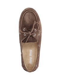 MIU MIU BROWN SUEDE LOAFERS WITH ROUND TOE, TOP LACE CLOSURE, TONE-ON-TONE LETTERING LOGO ON THE FRONT TAB, RUBBER SOLE. PRODUCT INFO PRODUCT CODE 5D123E D005 ZIJF0003 COMPOSITION: 100% CALF LEATHER MADE IN: ITALY - SOLE: 100% RUBBER
