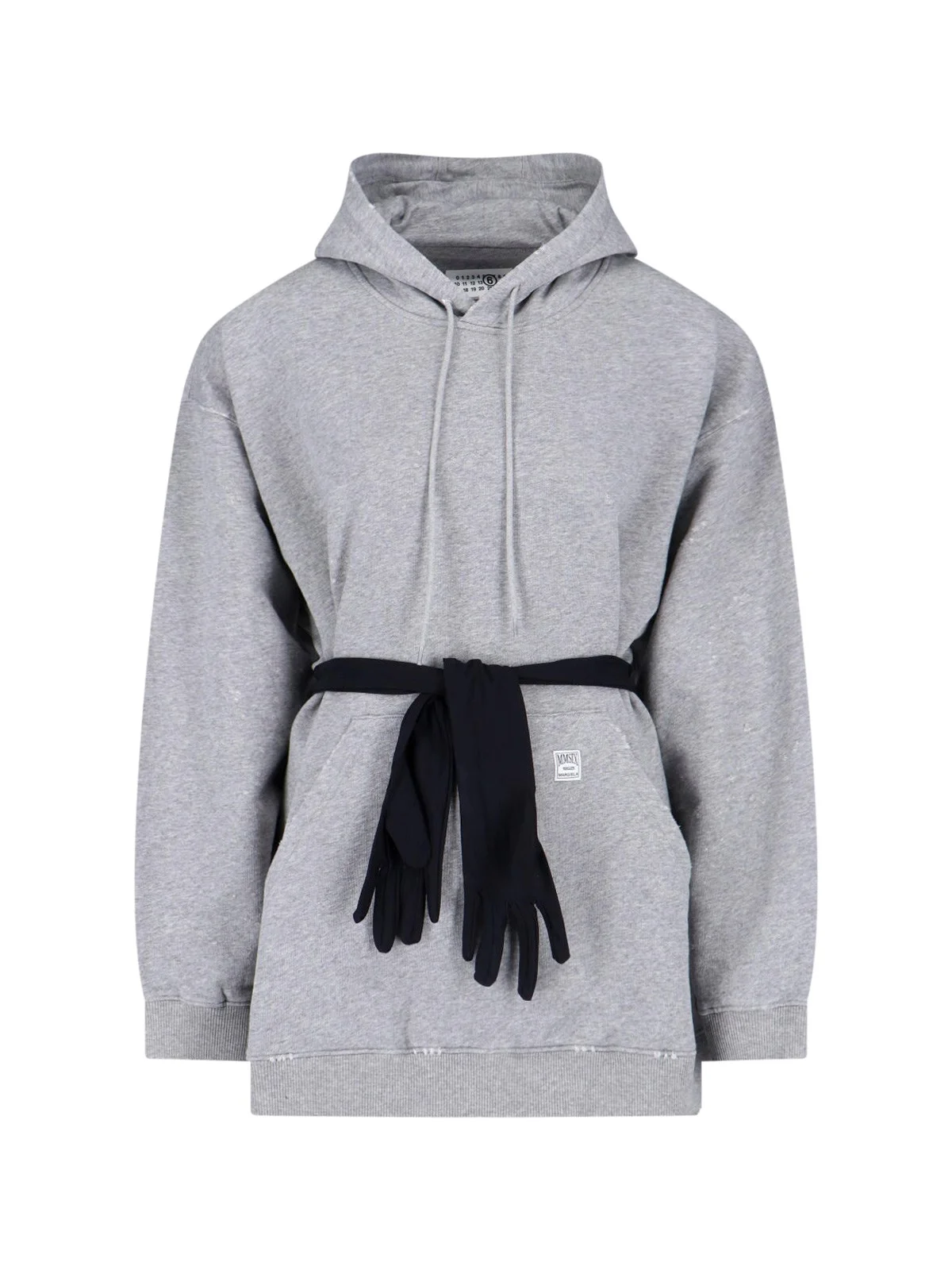 MAISON MARGIELA MM6 MINI DRESS WITH GLOVES IN GRAY COTTON WITH DRAWSTRING HOOD, DROPPED SHOULDERS, ADJUSTABLE GLOVES DETAIL ON THE WAIST, FRONT LOGO LABEL, MAXI FRONT POCKET, RIBBED TRIM, DISTRESSED EFFECT, STRAIGHT HEM. PRODUCT INFO PRODUCT CODE S52DA0083 M25025853M COMPOSITION: 100% COTTON SIZE AND FIT: SOFT FIT MADE IN: ITALY