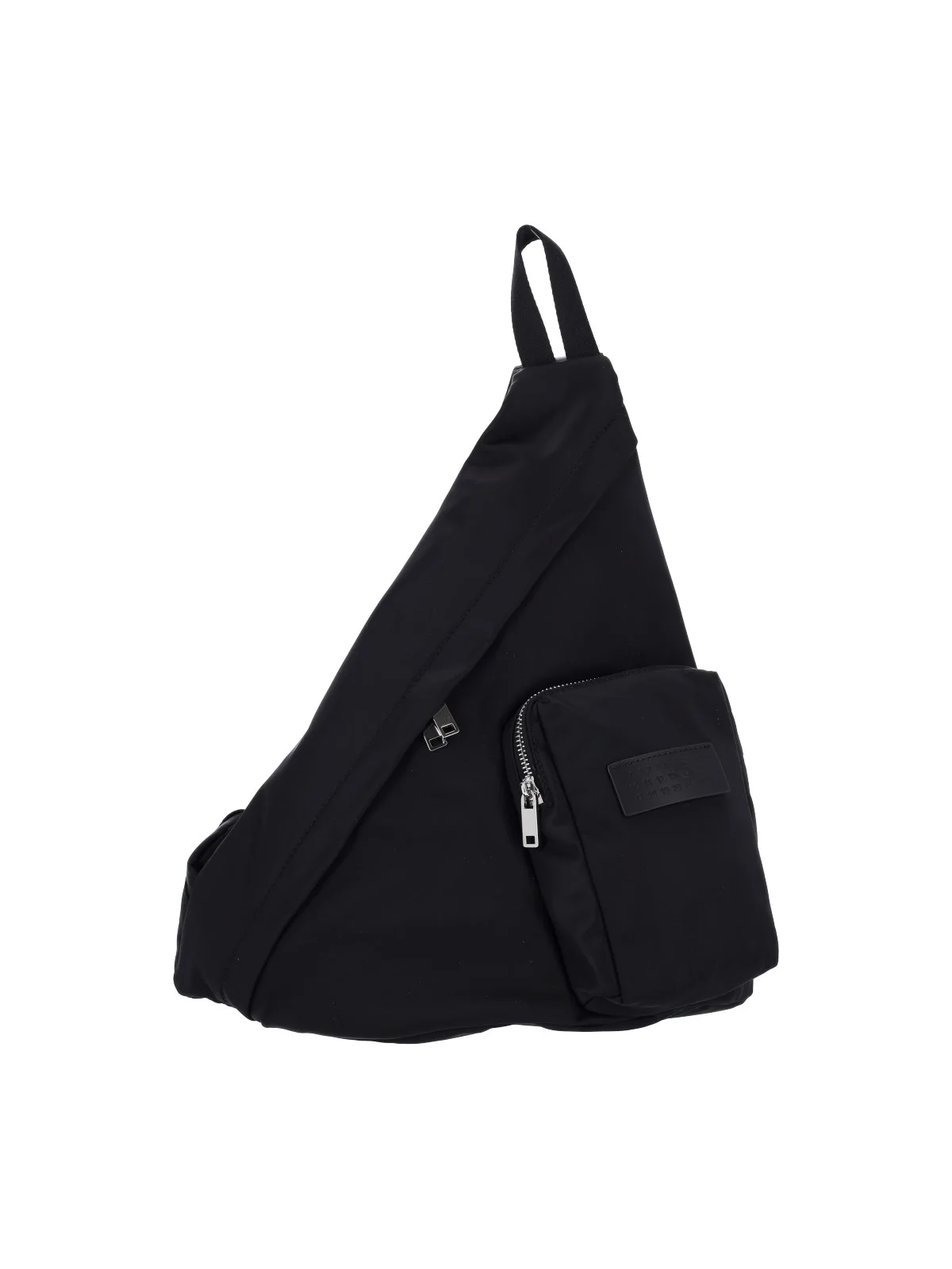 ONE-SHOULDER BACKPACK "JAPANESE SLING BAG" MM6 MAISON MARGIELA IN BLACK FABRIC, ONE TOP HANDLE, ADJUSTABLE BACK SHOULDER STRAP, DOUBLE ZIP CLOSURE, ONE FRONT ZIP CARGO POCKET, TONE-ON-TONE LOGO TAG ON THE FRONT, ONE MAIN INNER COMPARTMENT. PRODUCT INFO PRODUCT CODE SB5WG0019 P8504T8013 COMPOSITION: 100% POLYAMIDE SIZE AND FIT: H 40 X W 29 X D 9 CM MADE IN: CHINA - STRAP SPAN: 64 - 97 CM