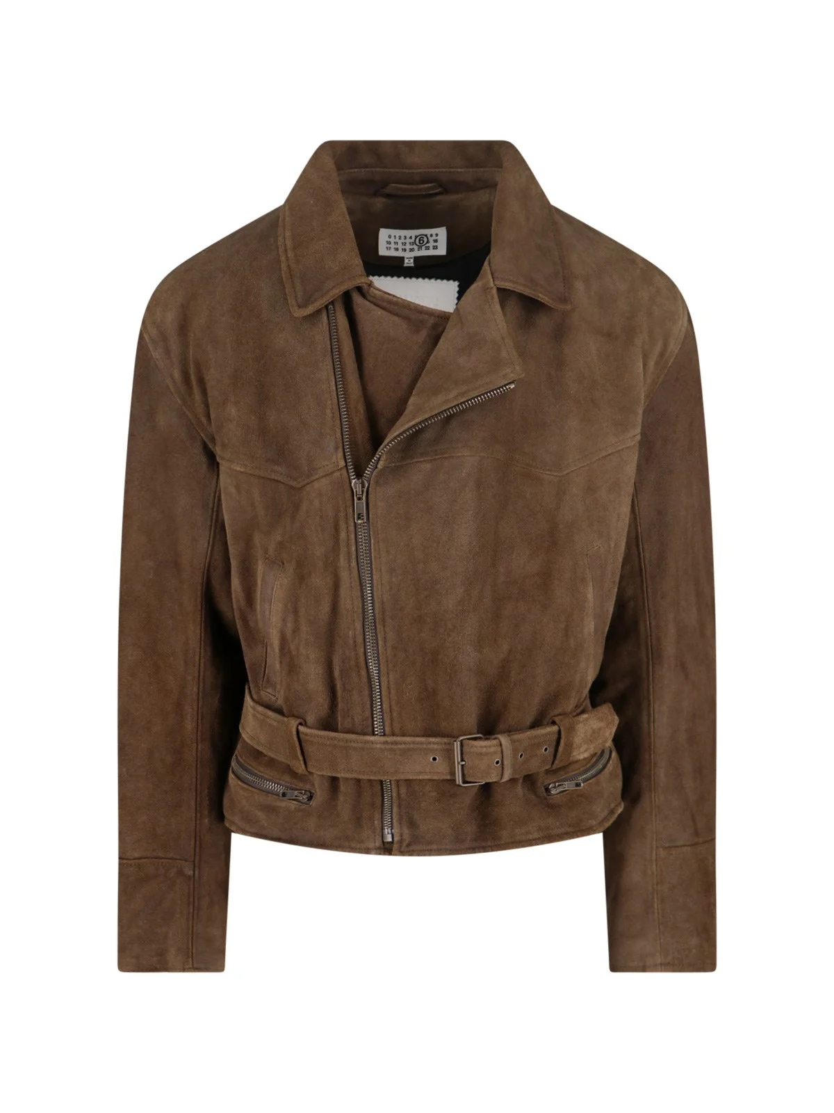 MAISON MARGIELA MM6 BROWN SUEDE BIKER JACKET WITH CLASSIC COLLAR, ASYMMETRIC ZIP CLOSURE, ADJUSTABLE BELT AT THE WAIST, TWO SIDE FLAT POCKETS, TWO SIDE ZIP POCKETS, STITCHING EMBROIDERY AT THE BACK, STRAIGHT HEM. PRODUCT INFO PRODUCT CODE SH2AM0037 M07012124 COMPOSITION: 100% CALF LEATHER SIZE AND FIT: CROPPED FIT MADE IN: ITALY - TRIMS: 100% METAL