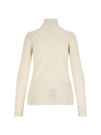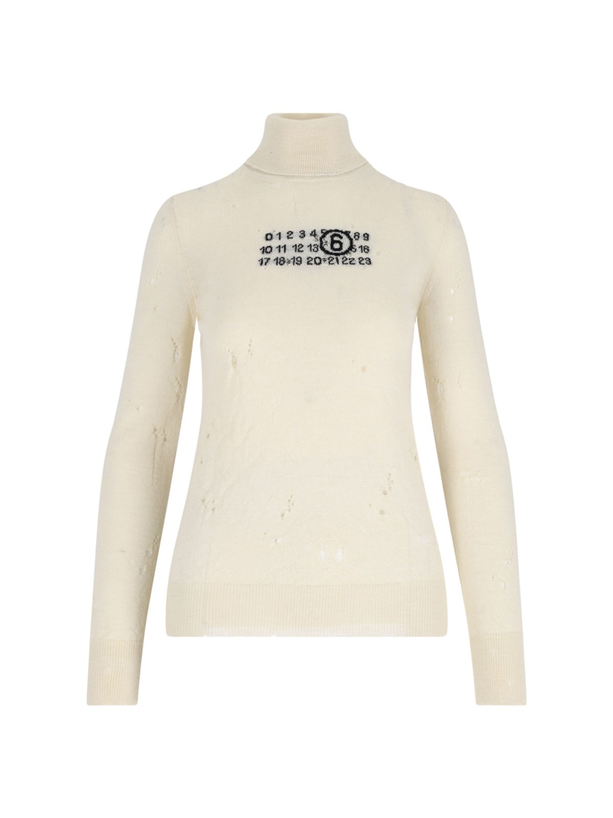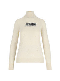 MAISON MARGIELA MM6 'NUMERIC' VIRGIN WOOL SWEATER, CREAM WITH ALL-OVER DESTROYED DETAILS, HIGH NECK, BLACK LOGO INTARSIA ON THE CHEST, WHITE LOGO STITCHING ON THE BACK, RIBBED TRIMS, STRAIGHT HEM. PRODUCT INFO PRODUCT CODE S52HA0299 M13134103 COMPOSITION: 100% VIRGIN WOOL SIZE AND FIT: REGULAR FIT MADE IN: ITALY