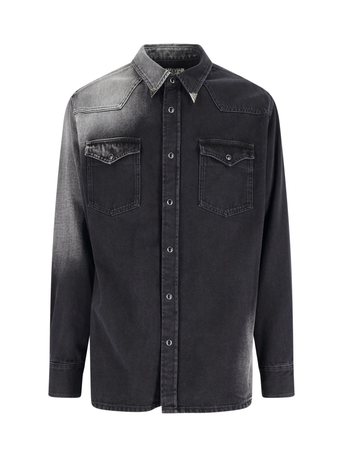 MAISON MARGIELA MM6 'WESTERN' SHIRT IN BLACK COTTON DENIM WITH WORN WASH, CLASSIC COLLAR, BUTTON CLOSURE, TWO FRONT BUTTON POCKETS, CONTRAST LOGO EMBROIDERY AT THE BACK, BUTTON CUFFS, STRAIGHT HEM. PRODUCT INFO PRODUCT CODE SH2DT0024 M30011969 COMPOSITION: 100% COTTON SIZE AND FIT: REGULAR FIT MADE IN: ITALY