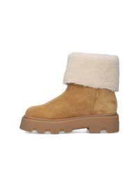 MONCLER 'AUREA' ANKLE BOOTS IN BROWN SUEDE WITH TOP PATTERN, ROUND TOE, MULTICOLOR EMBROIDERED LOGO ON THE FRONT, EMBOSSED LOGO ON THE BACK SOLE, RUBBER SOLE. PRODUCT INFO PRODUCT CODE 09B 4F000 70 M697123L COMPOSITION: 100% CALF LEATHER SIZE AND FIT: HEIGHT 4 CM MADE IN: ITALY - SOLE: 100% RUBBER