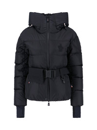 MONCLER GRENOBLE 'BOUQUETIN' DOWN JACKET IN BLACK FABRIC WITH PADDED DESIGN, DRAWSTRING HOOD, HIGH NECK, DOUBLE ZIP AND REMOVABLE BUCKLE CLOSURE, POCKET AND CARABINER DETAIL, LOGO EMBROIDERY ON THE FRONT, CUT-OUT DETAIL ON CUFFS, STRAIGHT HEM. PRODUCT INFO PRODUCT CODE 098 1A000 68 595JN999 COMPOSITION: 100% POLYESTER SIZE AND FIT: REGULAR FIT MADE IN: ROMANIA - SIZE SCALE: "NUMERIC" - PADDING: 90% DOWN, 10% FEATHER