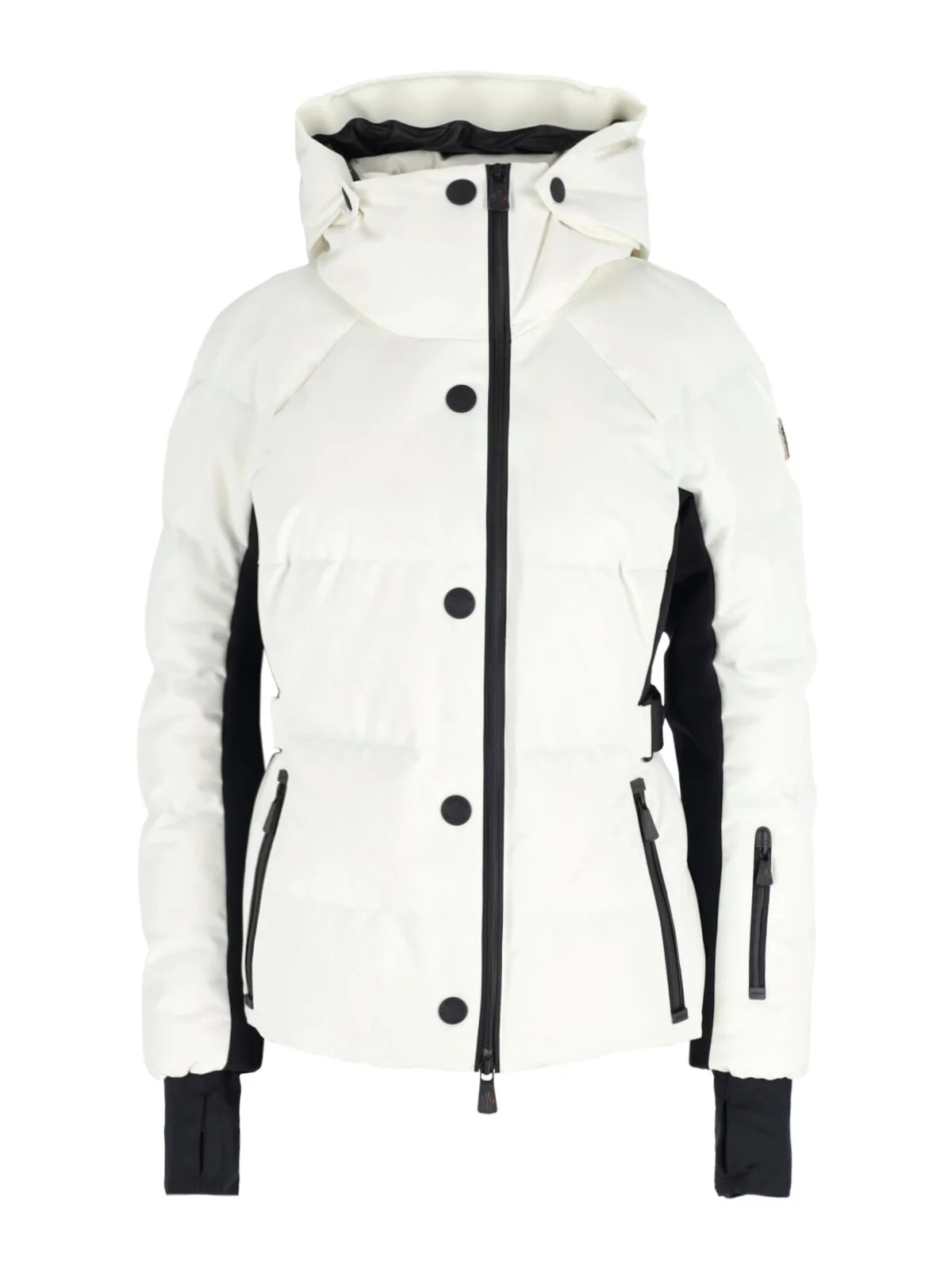 MONCLER GRENOBLE “GUYANE” DOWN JACKET IN WHITE FABRIC, PADDED DESIGN, HIGH COLLAR, REMOVABLE HOOD, ZIP AND BUTTON CLOSURE, TWO SIDE ZIP POCKETS, ZIP POCKET ON SLEEVE, LOGO EMBROIDERY ON SLEEVE, ADJUSTABLE WAIST BELT, ONE INTERNAL ZIP POCKET, CUT-OUT DETAIL ON CUFFS, STRAIGHT HEM. PRODUCT INFO PRODUCT CODE 098 1A000 48 5985N041 COMPOSITION: 87% POLYAMIDE, 13% ELASTANE SIZE AND FIT: REGULAR FIT MADE IN: ROMANIA