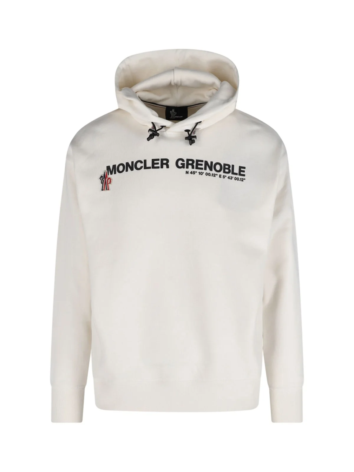 MONCLER GRENOBLE LOGO HOODIE IN CREAM COTTON WITH DRAWSTRING HOOD, CONTRASTING EMBOSSED LOGO ON THE FRONT, RIBBED TRIM, STRAIGHT HEM. PRODUCT INFO PRODUCT CODE 097 8G000 17 80451041 COMPOSITION: 100% COTTON SIZE AND FIT: REGULAR FIT MADE IN: TURKEY