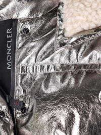 MONCLER GRENOBLE 'CALAQUE' PADDED DOWN JACKET IN SILVER FABRIC WITH BUTTON HOOD, ADJUSTABLE DRAWSTRING, LONG SLEEVES, BUTTON CLOSURE, TWO FRONT BUTTON FLAP POCKETS, TWO ZIP POCKETS ON THE SLEEVE, AN INNER ZIP POCKET, BUTTON CUFFS, STRAIGHT HEM. PRODUCT INFO PRODUCT CODE 098 1A000 11 596U2M90 COMPOSITION: 83% POLYAMIDE, 17% ELASTANE SIZE AND FIT: REGULAR FIT MADE IN: ROMANIA