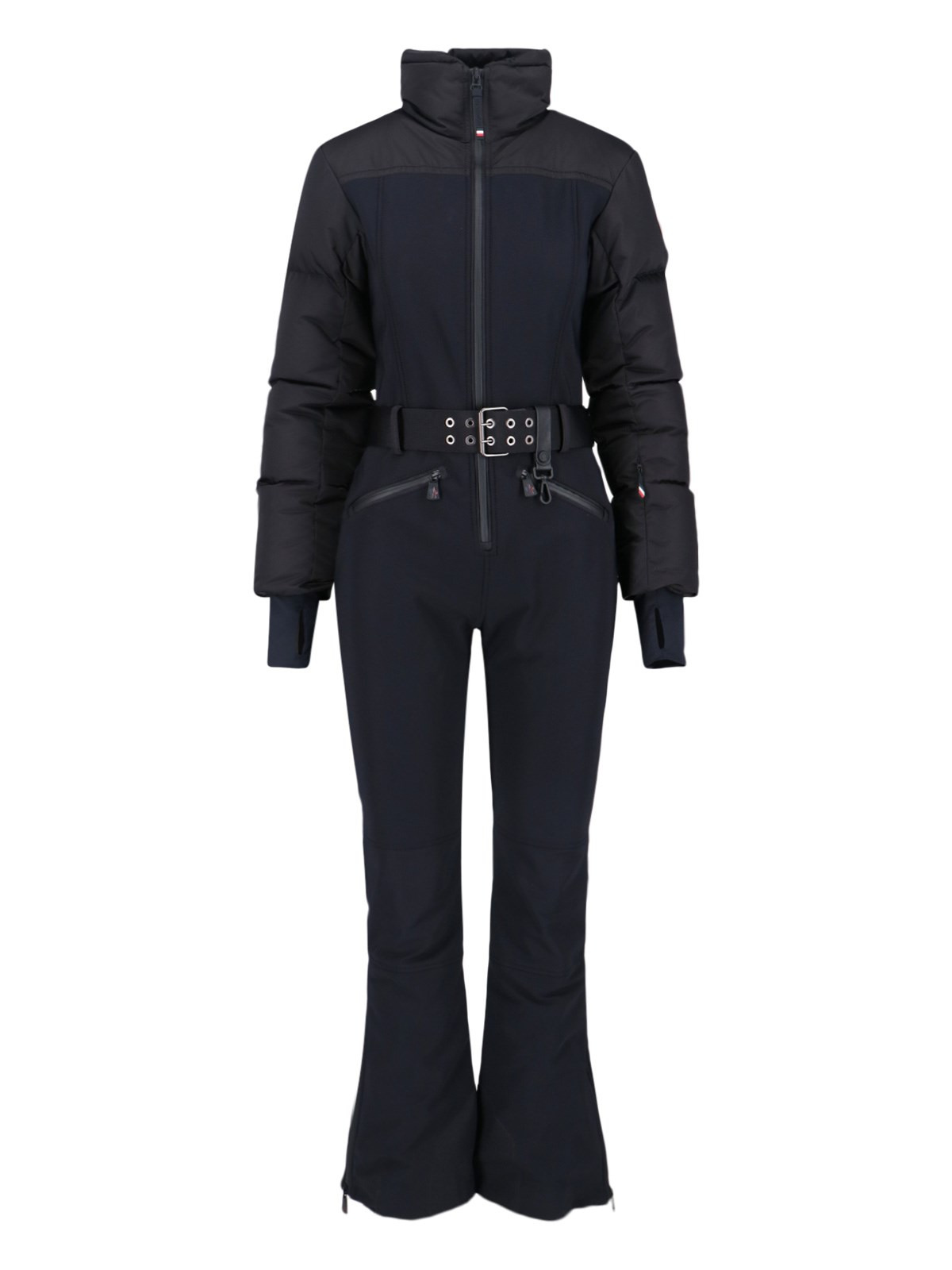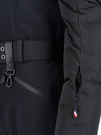 MONCLER GRENOBLE BELTED SKI SUIT IN BLACK WATER-REPELLENT FABRIC WITH PADDED AND QUILTED DESIGN, HIGH NECK, ZIP CLOSURE, TWO SIDE ZIP POCKETS, CONTRASTING LOGO PATCH ON THE SLEEVE, ADJUSTABLE AND REMOVABLE WAIST BELT, KEYRING DETAIL WITH SNAP HOOK, ONE ZIP POCKET ON THE SLEEVE, CUT-OUT DETAIL ON THE CUFF, ELASTIC TRIMS, WIDE LEG. PRODUCT INFO PRODUCT CODE 098 2G000 07 M7656999 COMPOSITION: 48% POLYESTER, 33% POLYAMIDE, 19% ELASTANE SIZE AND FIT: REGULAR FIT MADE IN: ROMANIA - FILLING: 90% DOWN, 10% FEATHERS - DETAILS: 100% LEATHER