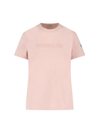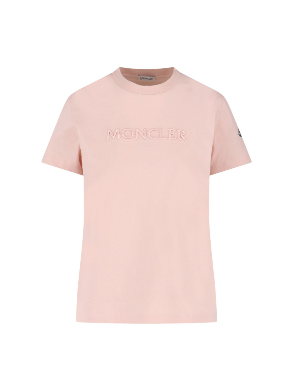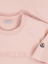 MONCLER LOGO T-SHIRT IN PINK COTTON WITH CREWNECK, SHORT SLEEVES, TONE-ON-TONE EMBOSSED LOGO ON THE FRONT, MULTICOLOR LOGO PATCH ON THE SLEEVE, AND STRAIGHT HEM. PRODUCT INFO PRODUCT CODE 093 8C000 12 89AUO519 COMPOSITION: 100% COTTON SIZE AND FIT: REGULAR FIT MADE IN: TURKEY