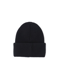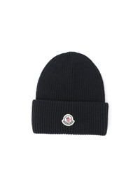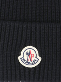 MONCLER VIRGIN WOOL AND CASHMERE BEANIE IN BLACK RIBBED KNIT, FRONT LOGO PATCH, TURN-UP DESIGN. PRODUCT INFO PRODUCT CODE 091 3B000 75 M1127999 COMPOSITION: 70% VIRGIN WOOL, 30% CASHMERE MADE IN: ITALY