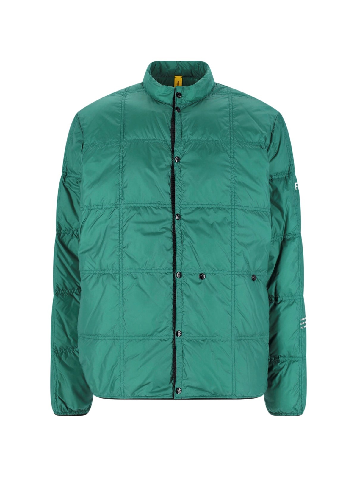 MONCLER GENIUS X FRGMT "JAYEL" LOGO DOWN JACKET IN GREEN NYLON WITH CHECK PATTERN, QUILTED AND PADDED DESIGN, HIGH NECK, BUTTON CLOSURE, TWO SIDE ZIP POCKETS, WHITE LOGO EMBROIDERY ON THE SLEEVE, LOGO PATCH DETAIL, ELASTIC HEM. PRODUCT INFO PRODUCT CODE 09U 1A000 06 M611484L COMPOSITION: 100% POLYAMIDE SIZE AND FIT: REGULAR FIT MADE IN: ROMANIA - "NUMERIC" SIZE SCALE - PRODUCT MADE FROM RECYCLED MATERIALS