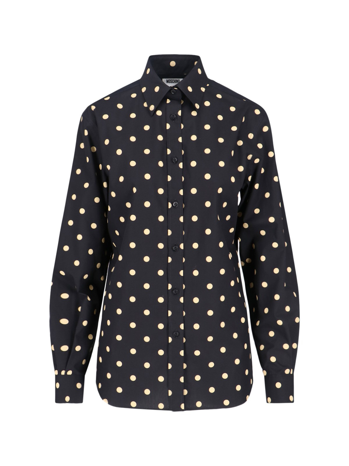MOSCHINO POLKA DOT SHIRT IN BLACK COTTON WITH BEIGE DETAILS, CLASSIC COLLAR, BUTTON CLOSURE, BUTTON CUFFS, CURVED HEM. PRODUCT INFO PRODUCT CODE 252D 0210 54552555 COMPOSITION: 100% COTTON SIZE AND FIT: REGULAR FIT MADE IN: ITALY