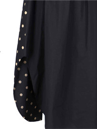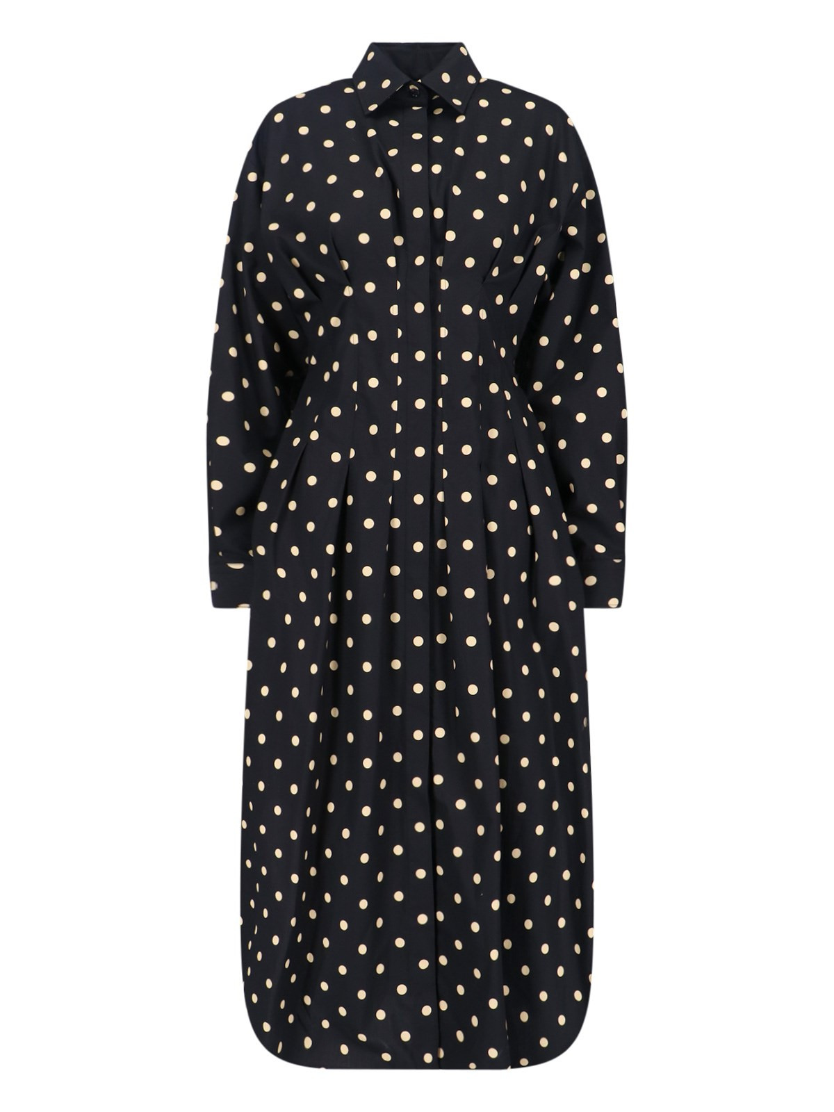 MOSCHINO POLKA DOT SHIRT DRESS IN BLACK COTTON, BEIGE ALL-OVER DETAILS ON THE FRONT, CLASSIC COLLAR, BUTTON CLOSURE, BUTTONS ON THE CUFFS, DRAPING AT THE BACK, CURVED HEM. PRODUCT INFO PRODUCT CODE 252D 0412 54552555 COMPOSITION: 100% COTTON SIZE AND FIT: REGULAR FIT MADE IN: HUNGARY