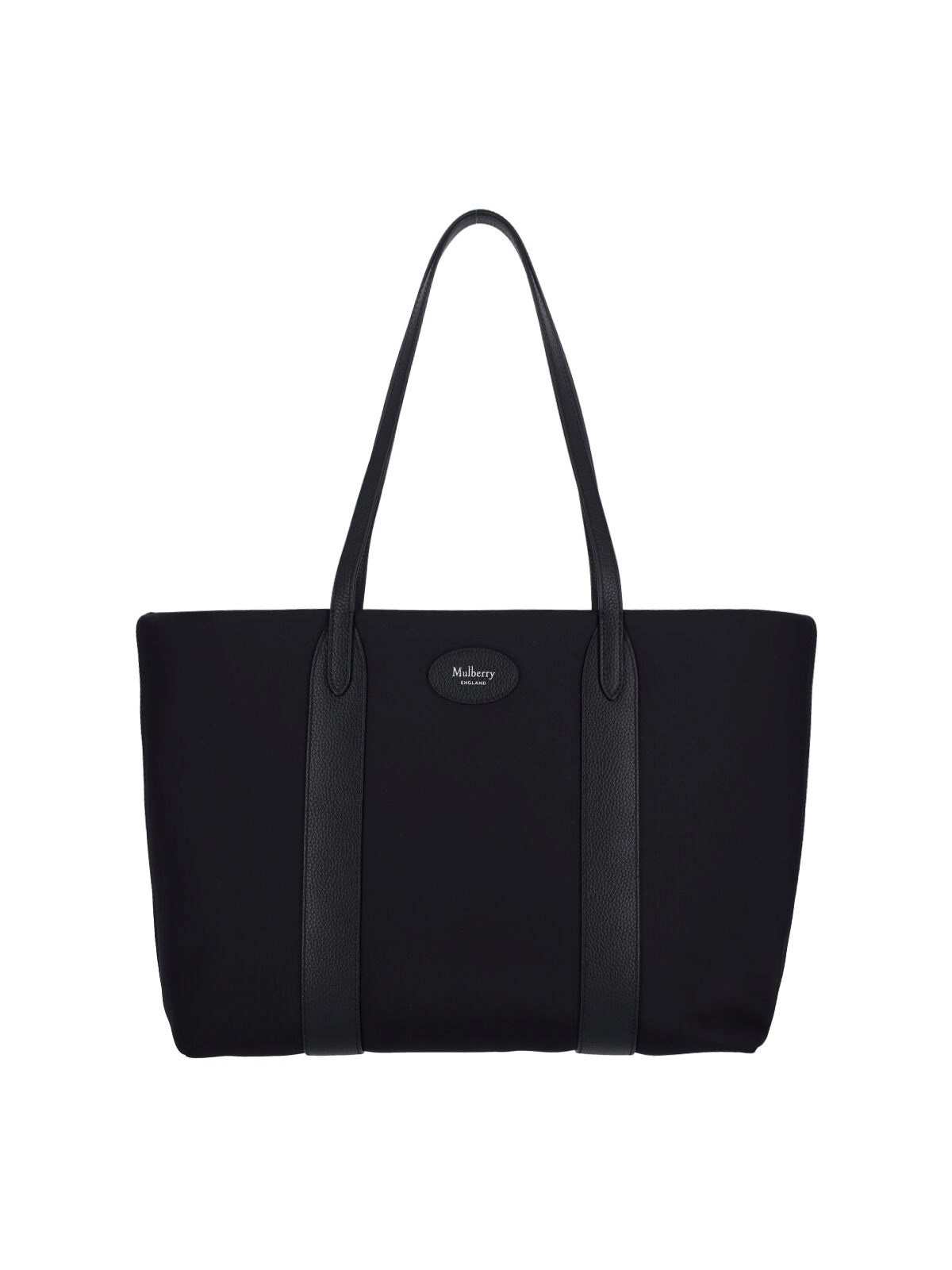 MULBERRY 'BAYSWATER' BLACK NYLON TOTE BAG WITH TWO HANDLES, LEATHER DETAILS, SNAP CLOSURE WITH LEATHER STRAP, ENGRAVED LOGO DETAIL, INNER FLAT ZIP POCKET, SINGLE INNER COMPARTMENT. PRODUCT INFO PRODUCT CODE HS5204 179A100 COMPOSITION: 70% POLYAMIDE, 30% CALF LEATHER SIZE AND FIT: H 28 X W 44 X D 13 CM MADE IN: CHINA - TRIMS: 100% CALF LEATHER - HANDLE DROP: 23 CM