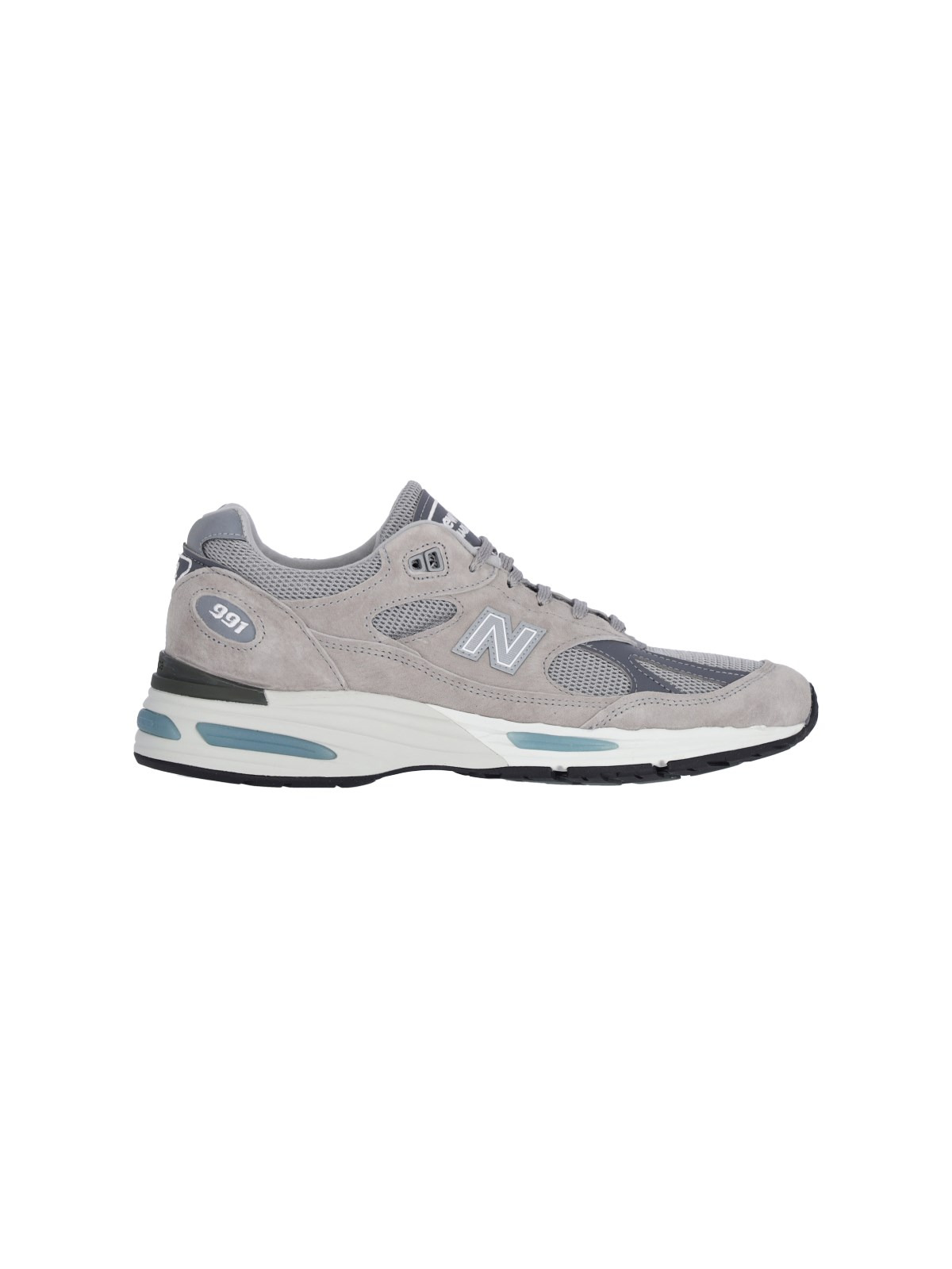NEW BALANCE MADE IN UK 991V2 SNEAKERS IN GRAY SUEDE WITH LEATHER INSERTS, MESH DETAILS, ROUND TOE, LACES, LOGO LABEL ON THE TONGUE, WHITE LOGO EMBROIDERY ON THE BACK, GRAY LOGO PATCH ON THE SIDE, AND RUBBER SOLE WITH LIGHT BLUE INSERTS. PRODUCT INFO PRODUCT CODE U991GL2 COMPOSITION: 100% LEATHER MADE IN: UK - TRIMS: 100% FABRIC - SOLE: 100% RUBBER