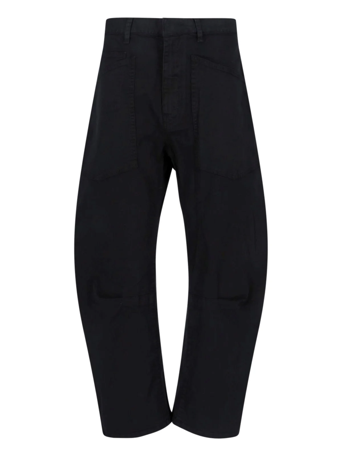 NILI LOTAN 'SHON' BLACK COTTON PANTS WITH ROUNDED DESIGN, ZIP AND HOOK CLOSURE, BELT LOOPS, FIVE POCKETS DESIGN, ROUNDED LEG. PRODUCT INFO PRODUCT CODE 10193 W12JET BLACK COMPOSITION: 98% COTTON, 2% ELASTANE SIZE AND FIT: REGULAR FIT MADE IN: USA