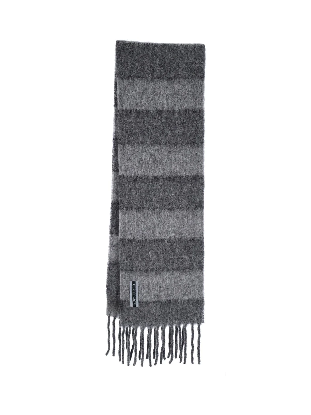 OUR LEGACY 'ESTATE' SCARF IN GREY ALPACA WOOL BLEND WITH LOGO LABEL ON THE FRONT, FRINGES ON THE EDGE. PRODUCT INFO PRODUCT CODE A2268ESSTATIC STRIPE FUZZY ALPACA COMPOSITION: 60% ALPACA, 20% WOOL, 15% POLYAMIDE SIZE AND FIT: H 220 X 27 CM MADE IN: ITALY