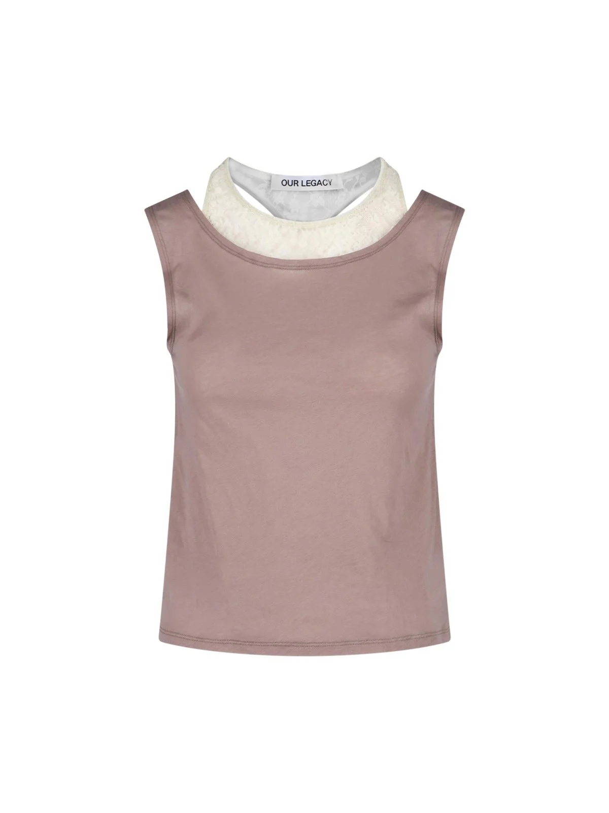 TANK TOP "SWIM" BROWN COTTON OUR LEGACY, CREW NECK, SLEEVELESS, CONTRASTING LACE DETAIL, STRAIGHT HEM. PRODUCT INFO PRODUCT CODE W2266SVVELVET SAND AIRVEIL COTTON COMPOSITION: 100% COTTON SIZE AND FIT: REGULAR FIT MADE IN: PORTUGAL