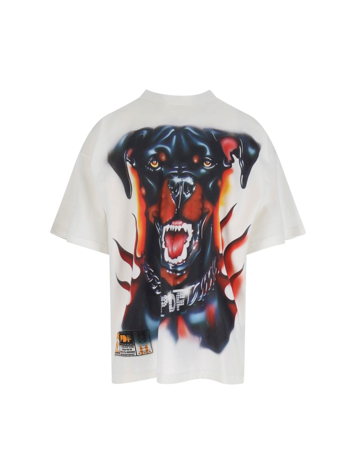 PDF 'THE BOY DOG' WHITE COTTON CREW NECK T-SHIRT WITH DROPPED SHOULDERS, MAXI MULTICOLOR PRINT ON THE FRONT, LOGO PATCH ON THE FRONT, LOGO PRINT ON THE BACK, STRAIGHT HEM. PRODUCT INFO PRODUCT CODE DFM54029TJ110WH DGWH DG COMPOSITION: 100% COTTON SIZE AND FIT: OVERSIZED FIT MADE IN: ITALY