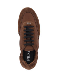 PRADA COLLAPSE SNEAKERS IN BROWN RE-NYLON WITH SUEDE TRIM, ROUND TOE, SILVER LOGO DETAIL, LACES, ELASTIC APPLIQUE ON THE SIDE, AND RUBBER SOLE. PRODUCT INFO PRODUCT CODE 1E959N 005 D7CF0BW5 COMPOSITION: 67% POLYAMIDE, 33% POLYESTER - TRIMS: 100% CALF LEATHER - SOLE: 100% RUBBER - PRODUCT MADE FROM RECYCLED MATERIALS