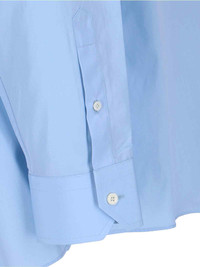 PRADA COTTON POPLIN SHIRT IN LIGHT BLUE WITH DROPPED SHOULDERS, ASYMMETRICAL COLLAR, BUTTON CLOSURE, TRIANGLE TONE-ON-TONE FABRIC LOGO EMBROIDERY ON THE BACK, BUTTON CUFFS, STRAIGHT HEM. PRODUCT INFO PRODUCT CODE P480I OOO 1XV2F0012 COMPOSITION: 100% COTTON SIZE AND FIT: SOFT FIT MADE IN: ITALY