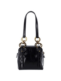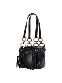 PRADA "DANGLE" MINI TRUNK IN BLACK CALF LEATHER WITH TWO HANDLES, ZIP CLOSURE, LEATHER KNOTTED ZIPPER DETAIL, A ZIP PATCH POCKET ON THE FRONT, EMBOSSED GOLD LOGO DETAIL, A SINGLE INNER COMPARTMENT. PRODUCT INFO PRODUCT CODE 1BB137 OOO 2CYRF0002 COMPOSITION: 100% CALF LEATHER SIZE AND FIT: H 14 X W 14.5 X D 13.5 CM MADE IN: ITALY - HANDLE DROP: 25 CM