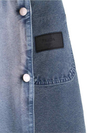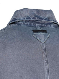 PRADA DISTRESSED BLOUSON IN LIGHT BLUE COTTON WITH DISTRESSED WASH, CLASSIC COLLAR, BUTTON CLOSURE, BUTTON FLAP POCKET ON THE CHEST, THREE FLAT PATCH POCKETS ON THE FRONT, TRIANGLE FABRIC LOGO ON THE BACK, BUTTON CUFFS, STRAIGHT HEM. PRODUCT INFO PRODUCT CODE GEB289 OOO 14W7F0008 COMPOSITION: 100% COTTON SIZE AND FIT: SOFT FIT MADE IN: ITALY
