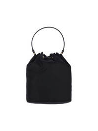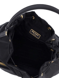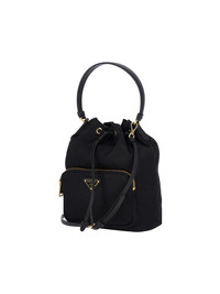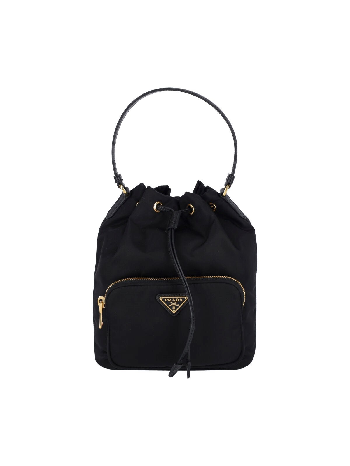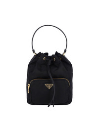 PRADA DUET BUCKET BAG IN BLACK NYLON WITH TOP HANDLE, ADJUSTABLE AND REMOVABLE SHOULDER STRAP, FRONT ZIPPER FLAP POCKET, GOLD ENAMELLED METAL TRIANGLE LOGO DETAIL, DRAWSTRING CLOSURE, SINGLE INNER COMPARTMENT. PRODUCT INFO PRODUCT CODE 1BH038 UOP RV44F0002 COMPOSITION: 100% RECYCLED POLYAMIDE SIZE AND FIT: H 22.5 X W 17.5 X D 12 CM MADE IN: ITALY - STRAP SPAN: 46-54 CM - PRODUCT MADE FROM RECYCLED MATERIALS