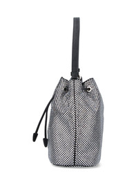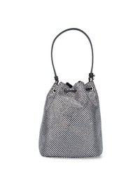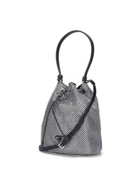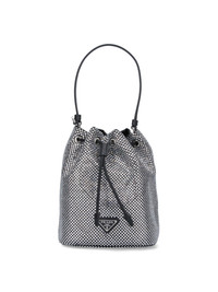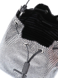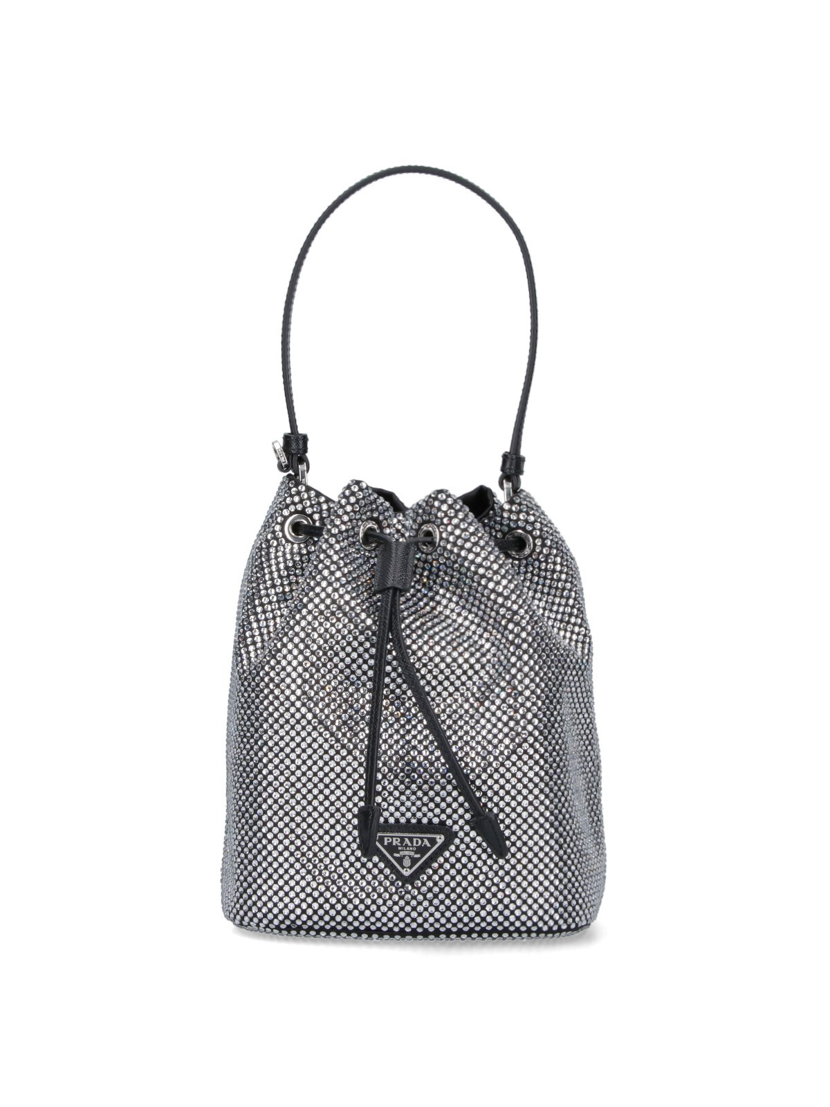 PRADA BUCKET BAG WITH BLACK 'DUET' RHINESTONES IN SILK AND VISCOSE, ALL-OVER RHINESTONES, TOP HANDLE, ADJUSTABLE AND REMOVABLE SHOULDER STRAP, DRAWSTRING CLOSURE, ENAMELED METAL LOGO ON THE FRONT, MAIN INNER COMPARTMENT. PRODUCT INFO PRODUCT CODE 1BE067 OOD 2HNJF0T7O COMPOSITION: 72% VISCOSE, 28% SILK SIZE AND FIT: H 22 X W 18 X D 12 CM MADE IN: ITALY - HANDLE DROP: 15 CM - STRAP SPAN: 120 - 138 CM