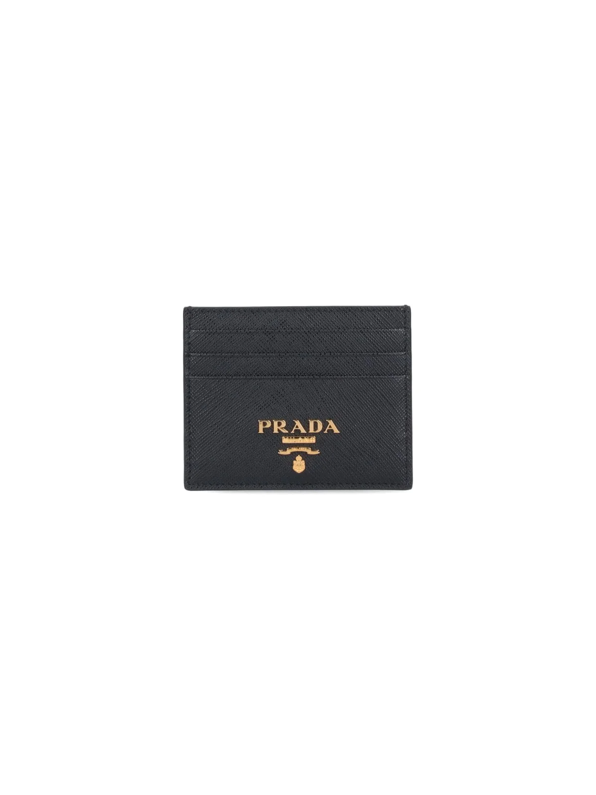 PRADA LOGO CARD HOLDER, SAFFIANO LEATHER, BLACK COLOUR, METALLIC GOLD LOGO DETAIL ON FRONT, THREE CARD SLOTS ON FRONT AND BACK, ONE INSIDE POCKET. PRODUCT INFO PRODUCT CODE 1MC025 QWAF0002 - 100% LEATHER - H 8 X W 10 CM - MADE IN ITALY - 1MC025 QWA-F0002 MADE IN: ITALY