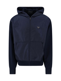 PRADA LOGO HOODIE IN NAVY BLUE COTTON BLEND WITH ZIP CLOSURE, FABRIC FRONT, ENAMELED METAL LOGO TAG ON THE CHEST, TWO SIDE POCKETS, ELASTICATED CUFFS AND WAIST, AND STRAIGHT HEM. PRODUCT INFO PRODUCT CODE UJL56C OOO 11JEF0QR3 COMPOSITION: MATERIAL 1: 70% COTTON, 30% POLYAMIDE, MATERIAL 2: 100% RECYCLED POLYAMIDE SIZE AND FIT: REGULAR FIT