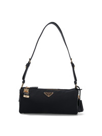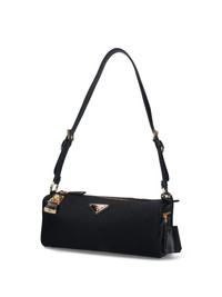 PRADA LOGO MEDIUM SHOULDER BAG IN BLACK RE-NYLON WITH LEATHER TRIM, ADJUSTABLE TOP HANDLE, GOLD METAL PADLOCK CHARM ON THE FRONT, GOLD ENAMELED METAL TRIANGLE LOGO ON THE FRONT, REMOVABLE GOLD METAL RING KEYRING ON THE SIDE, TWO SIDE ZIP POCKETS, ZIP CLOSURE, INNER ZIP POCKET, MAIN INNER COMPARTMENT. PRODUCT INFO PRODUCT CODE 1BC233 ODO 2C8QF0002 COMPOSITION: 100% NYLON SIZE AND FIT: H 12 X W 27 X D 10.5 CM MADE IN: ITALY - TRIMS: 100% LEATHER - HANDLE DROP: 32 CM - PRODUCT MADE FROM RECYCLED MATERIALS