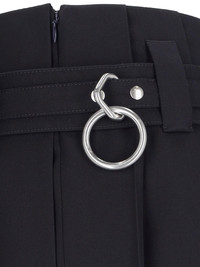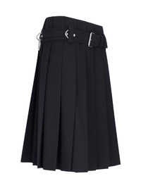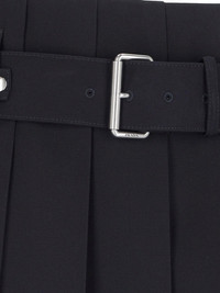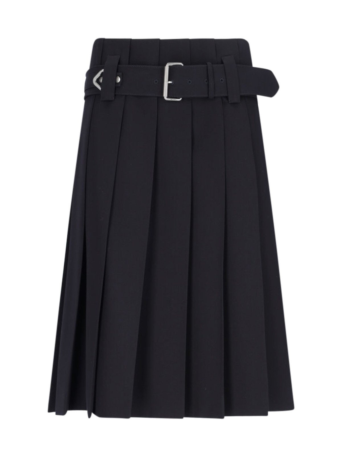PRADA LOGO MIDI SKIRT IN BLACK WOOL WITH LOW WAIST, BELT LOOPS, BUCKLE WITH SILVER BRASS DETAILS, ENGRAVED LOGO, PLEATED DETAIL, STRAIGHT HEM. PRODUCT INFO PRODUCT CODE P184YH OOO 108NF0008 COMPOSITION: 100% WOOL SIZE AND FIT: FIT: REGULAR MADE IN: ITALIA