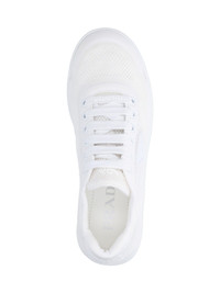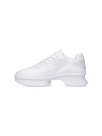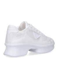 PRADA LOGO SNEAKERS IN WHITE MESH WITH LAMBSKIN TRIM, ROUND TOE, LACE-UP CLOSURE, TONE-ON-TONE LOGO DETAIL, TRIANGLE LOGO APPLIQUE ON THE SIDE, EMBOSSED LOGO ON THE BACK TAB, RUBBER PLATFORM SOLE. PRODUCT INFO PRODUCT CODE 1E937N 050 YZUF0009 COMPOSITION: 100% POLYESTER MADE IN: ITALY - TRIMS: 100% LAMBSKIN