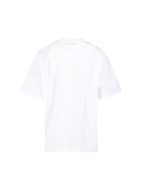 PRADA LOGO T-SHIRT IN WHITE COTTON WITH CREW NECK, SHORT SLEEVES, TRIANGLE FABRIC LOGO ON THE BACK, LOGO LABEL DETAIL, STRAIGHT HEM. PRODUCT INFO PRODUCT CODE 3556B OOO 11CDF0009 COMPOSITION: 100% COTTON SIZE AND FIT: OVERSIZED FIT MADE IN: ROMANIA