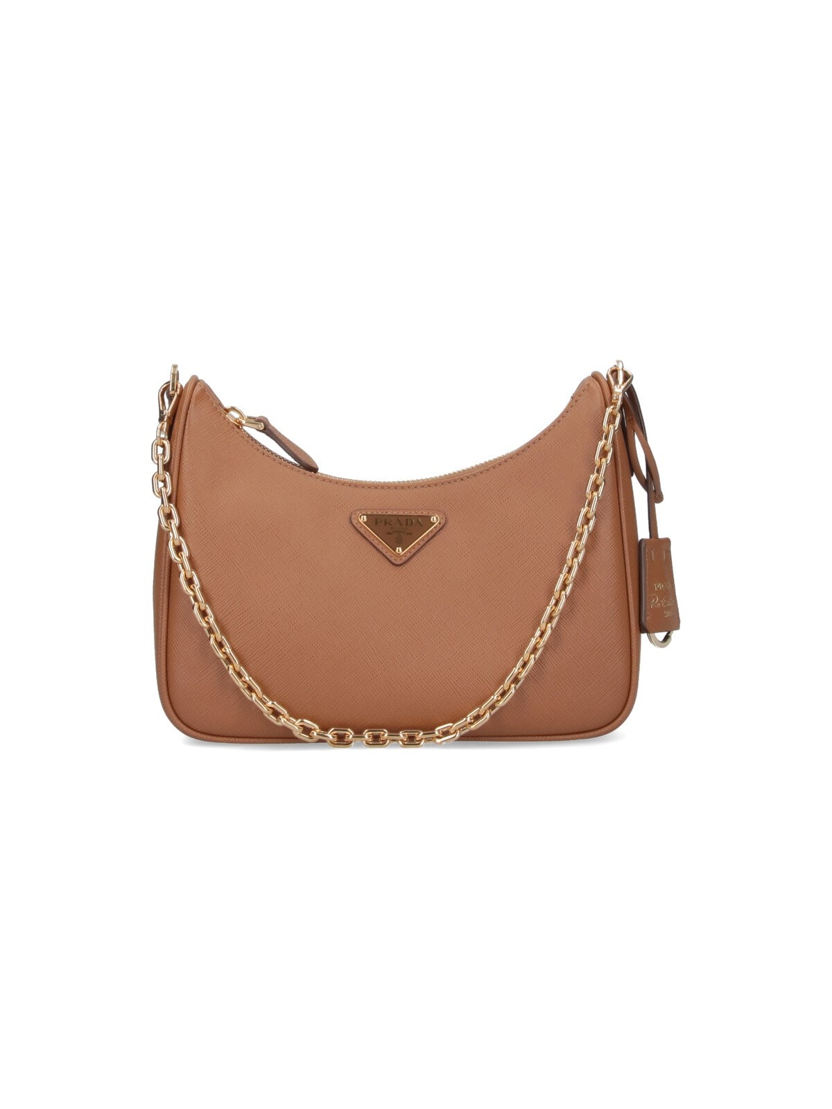 PRADA MINI RE-EDITION BAG IN BROWN SAFFIANO LEATHER WITH REMOVABLE GOLD METAL CHAIN HANDLE, REMOVABLE RING KEYRING DETAIL, ADJUSTABLE AND REMOVABLE SHOULDER STRAP, ZIP CLOSURE, BROWN ENAMELED METAL TRIANGLE LOGO ON THE FRONT, SINGLE INNER COMPARTMENT. PRODUCT INFO PRODUCT CODE 1BH204 V2P NZVF03CW COMPOSITION: 100% CALF LEATHER SIZE AND FIT: H 18 X W 22 X D 6 CM MADE IN: ITALY
